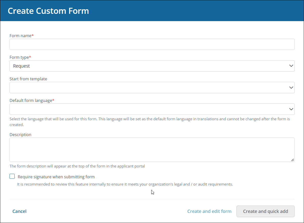 Note: The form type you choose will depend on how you plan to use it. Types are distinguished by audience (Applicants ). Additionally, some program features require a specific type to be used. For example, Program Automation requires a Routing Form. For more information, see About Form Types.