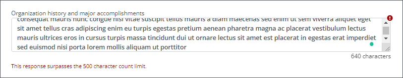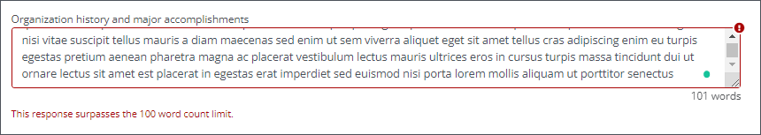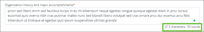 Text-based form field types can be configured to limit the number of words or characters permitted in responses. The system will automatically validate entries against these requirements, presenting a custom error message to the Applicant or Grant Manager when needed.