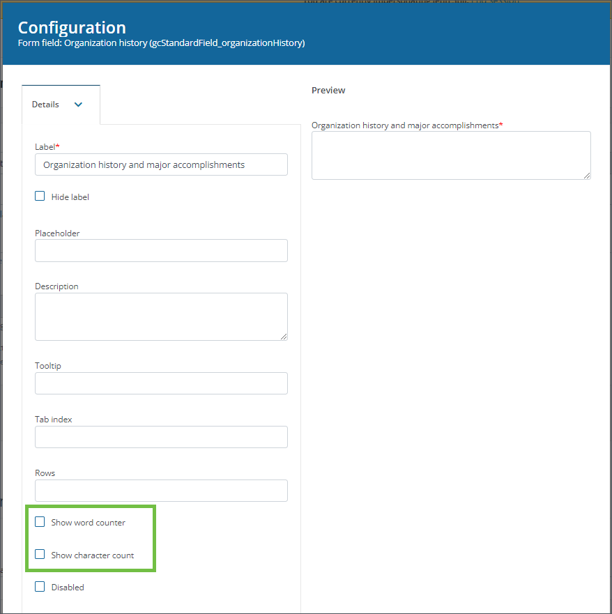 Tip: It is recommended to enable the Show character count option in the Configuration > Details tab to help your Applicants and Grant Managers more easily recognize when they are approaching the limit.