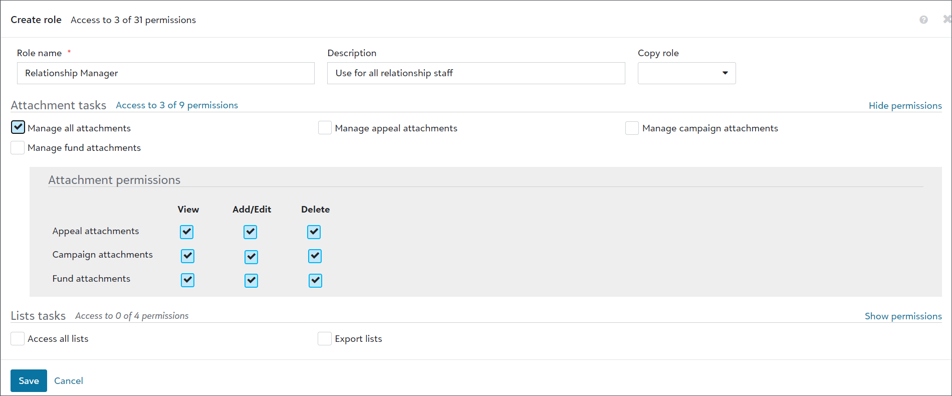 For example, select Manage appeal attachments to provide full access to Appeal attachments. To limit access to Campaign Attachments, select Show permissions. Then, select its Add/Edit permission. This provides users in the role with full access to Appeal Attachments, but only with add and edit rights to Campaign Attachments. They can't delete data for Campaign Attachments. For more information, see Permissions.