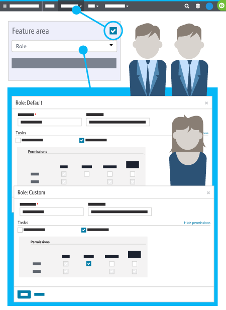 Customize roles by selecting individual permissions options for tasks, such as View and Add/Edit. For more information, see Permissions.